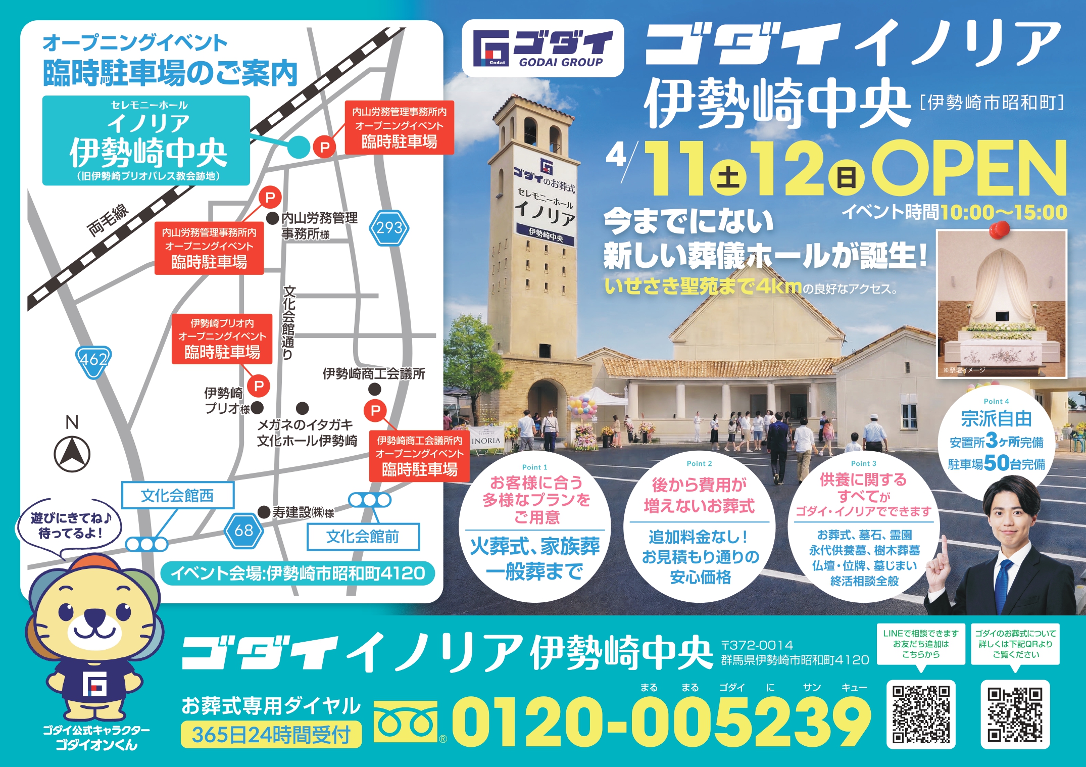 ゴダイの新しいお葬式ホール【ゴダイ・イノリア伊勢崎中央ホール】が伊勢崎市昭和町にいよいよオープンいたします。